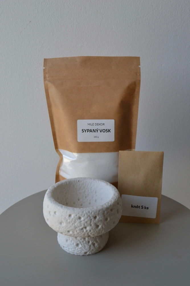 1. nasypte do nádoby vrstvu perličiek, odporúčame nasypať minimálne 3 cm vrstvu vosku.