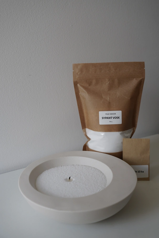 1. nasypte do nádoby vrstvu perličiek, odporúčame nasypať minimálne 3 cm vrstvu vosku.