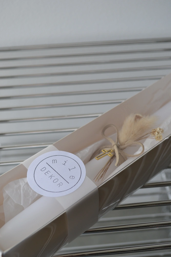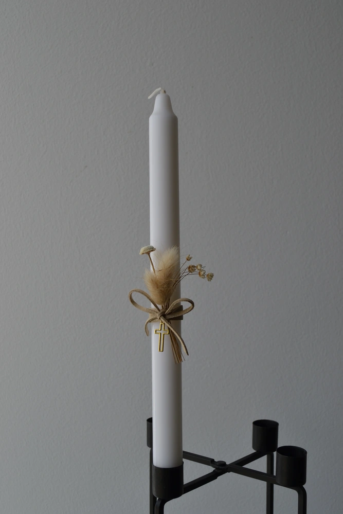 moderný dizajn krstovej sviečky zaujme na prvý pohľad. dozdobená stabilizovanými kvetmi, krížikom, previazaná semišovou stuhou. na výber sú 4 farebné varianty. ku každej krstovej sviečke je pribalená aj papierová manžeta proti stekaniu vosku. MOŽNOSŤ PERSONALIZÁCIE. na sviečku vieme doplniť iniciálku, meno prípadne dátum narodenia či krstu. pri možnosti personalizácie, nám do poznámky napíšte ako si prajete sviečku doladiť.