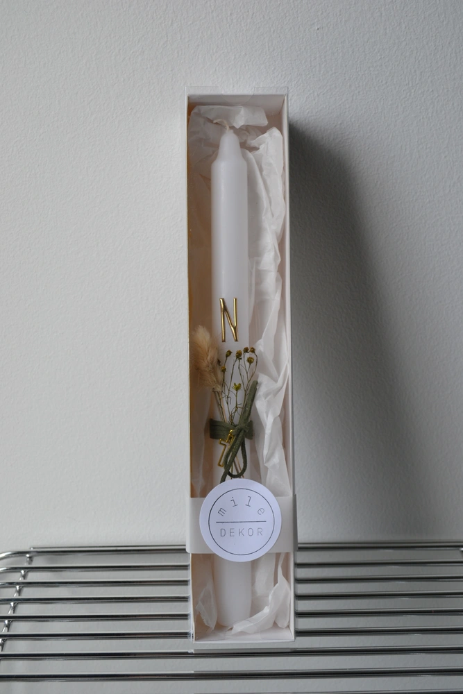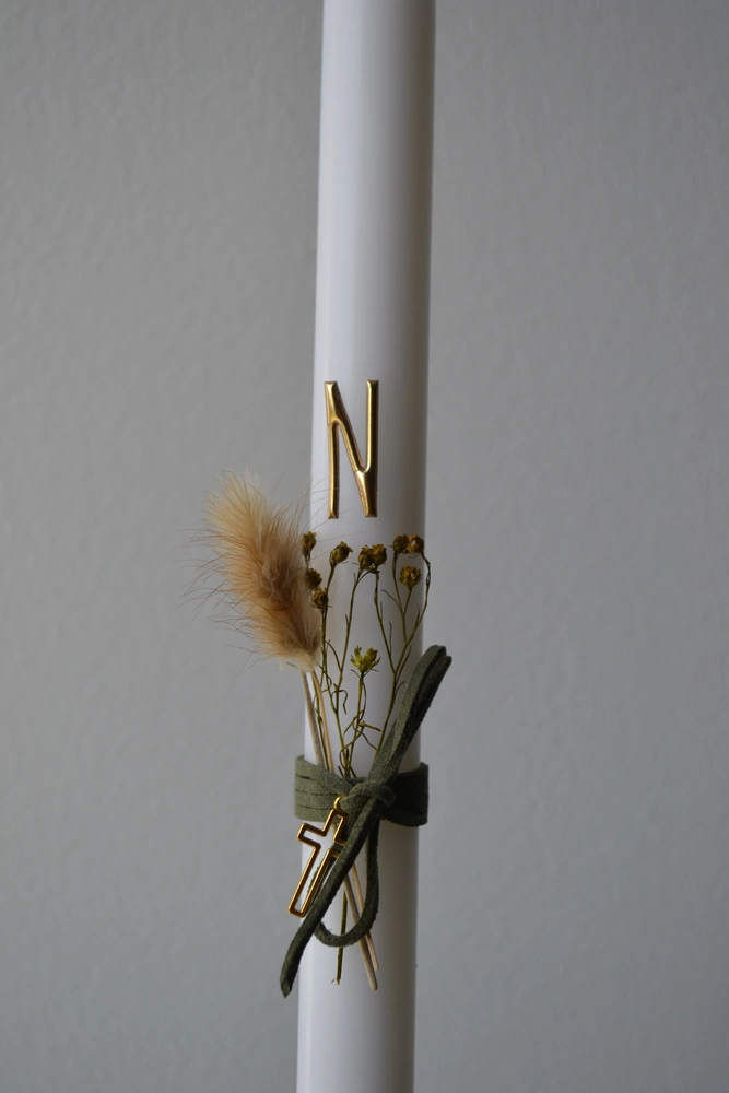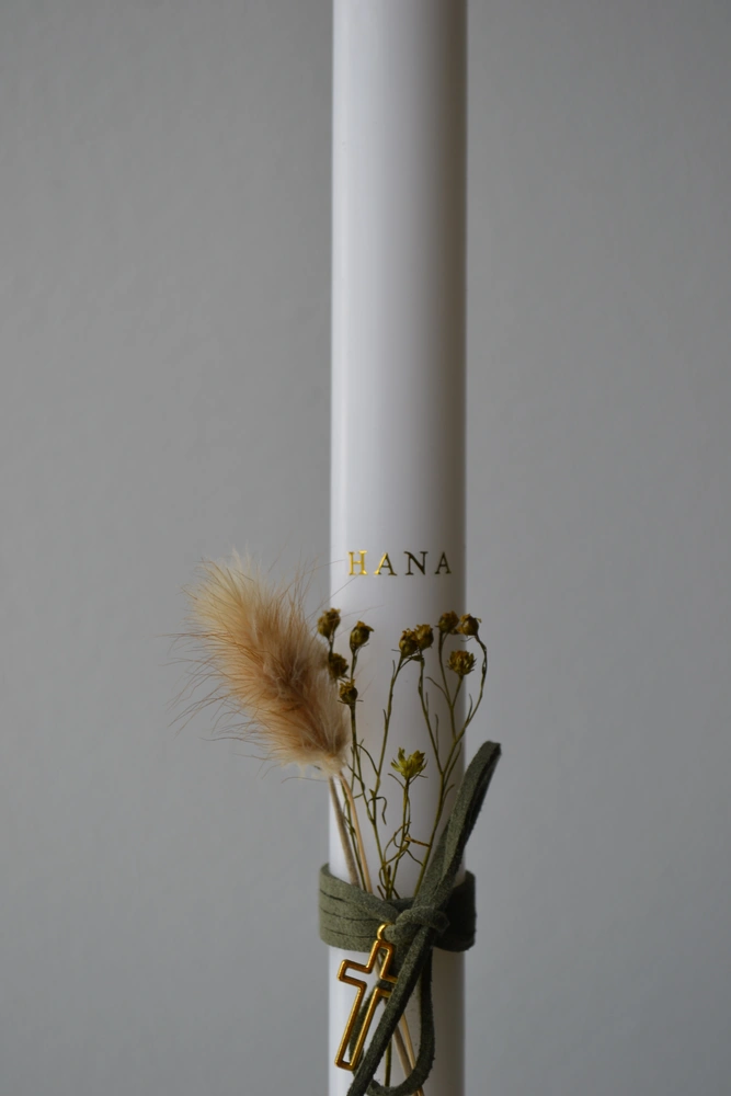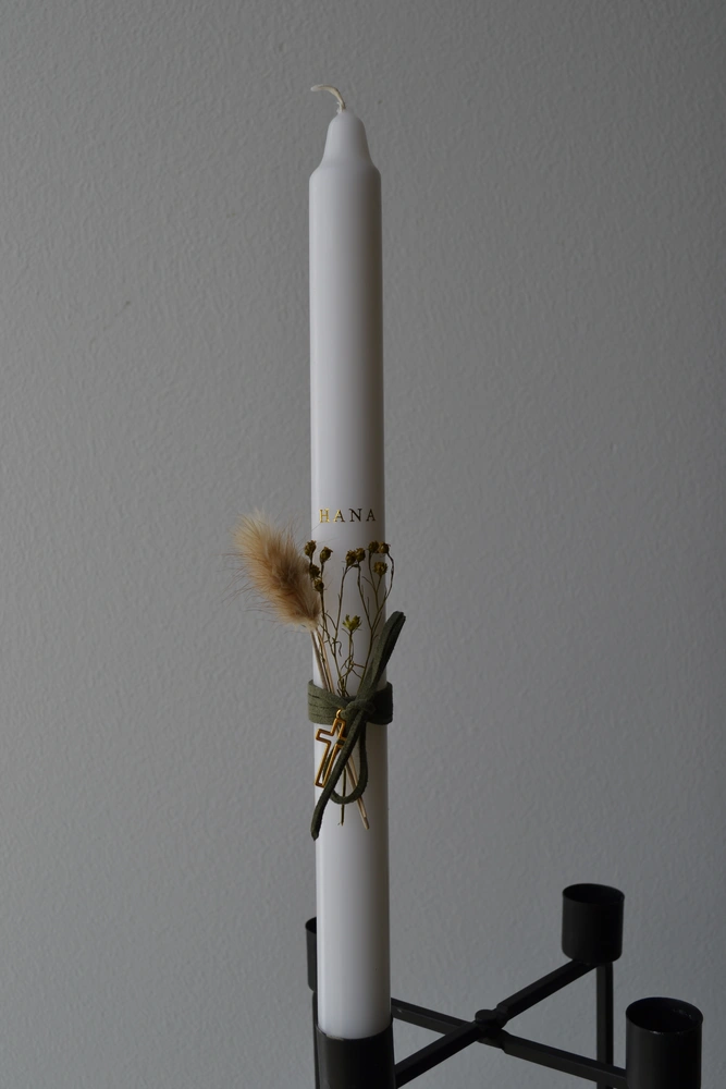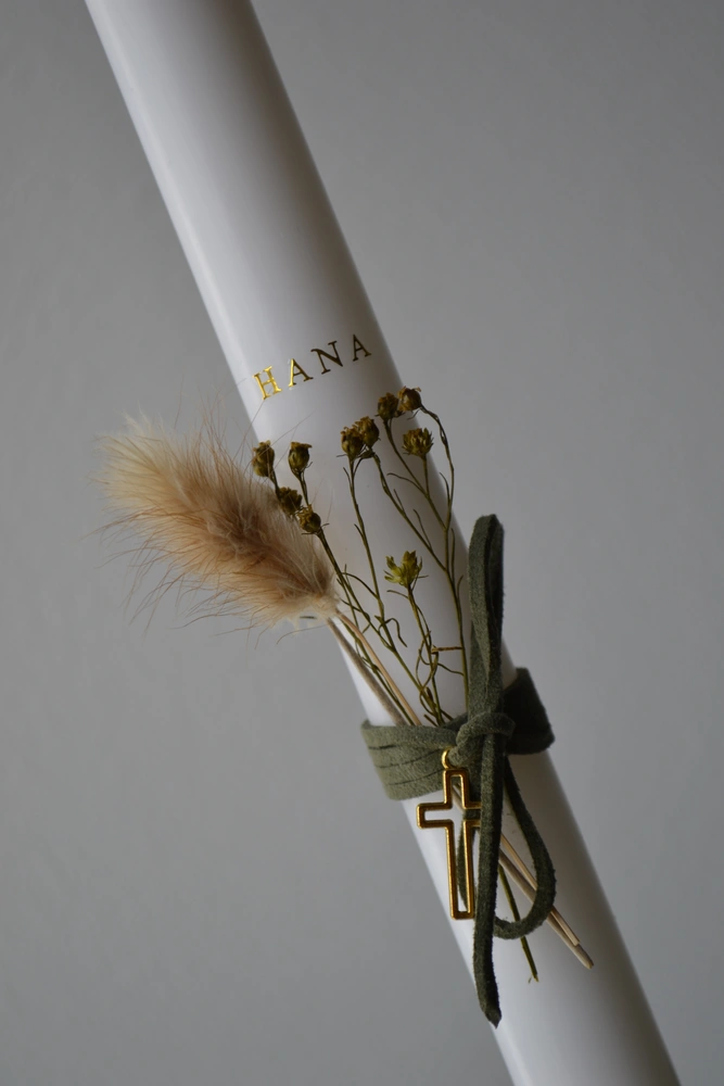 moderný dizajn krstovej sviečky zaujme na prvý pohľad. dozdobená stabilizovanými kvetmi, krížikom, previazaná semišovou stuhou. na výber sú 4 farebné varianty. ku každej krstovej sviečke je pribalená aj papierová manžeta proti stekaniu vosku. MOŽNOSŤ PERSONALIZÁCIE. na sviečku vieme doplniť iniciálku, meno prípadne dátum narodenia či krstu. pri možnosti personalizácie, nám do poznámky napíšte ako si prajete sviečku doladiť.
