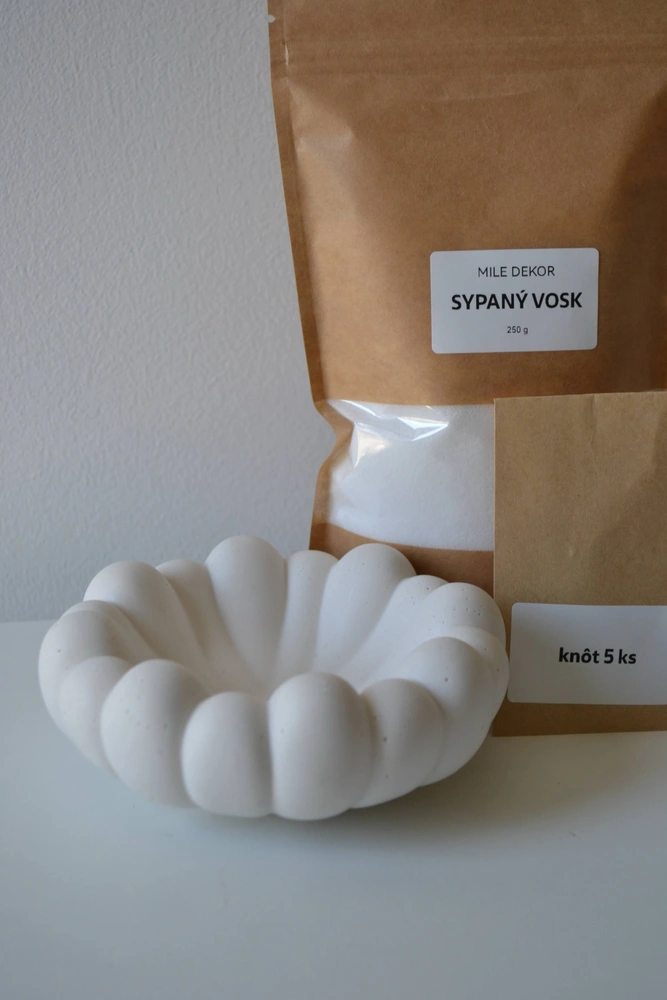1. nasypte do nádoby vrstvu perličiek, odporúčame nasypať minimálne 3 cm vrstvu vosku.