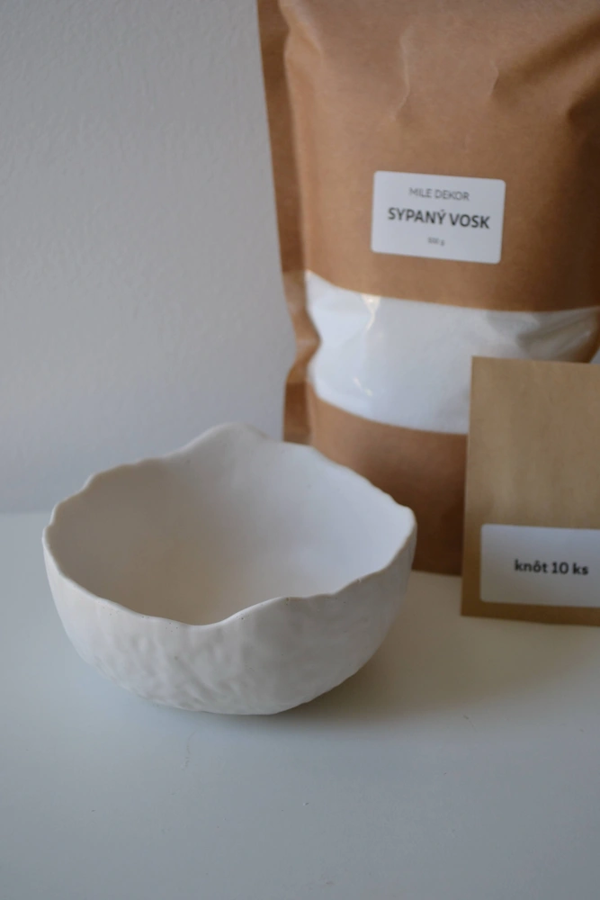 1. nasypte do nádoby vrstvu perličiek, odporúčame nasypať minimálne 3 cm vrstvu vosku.