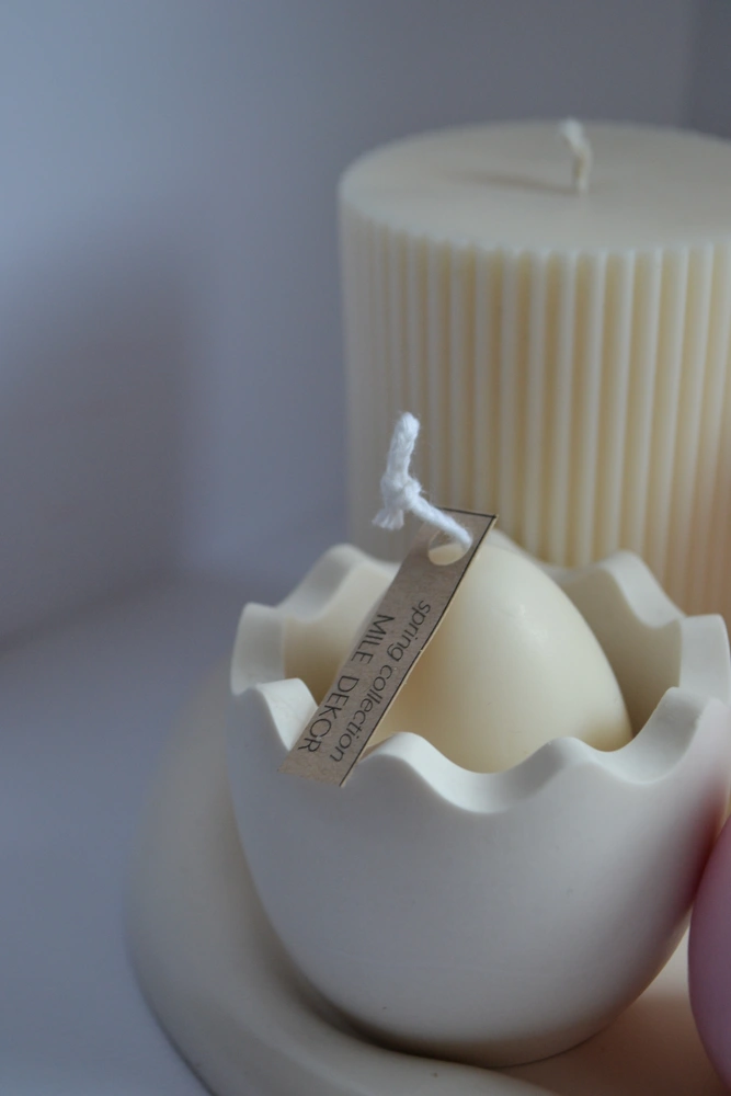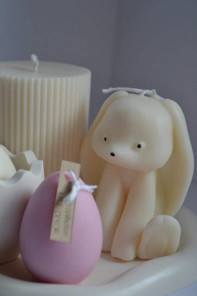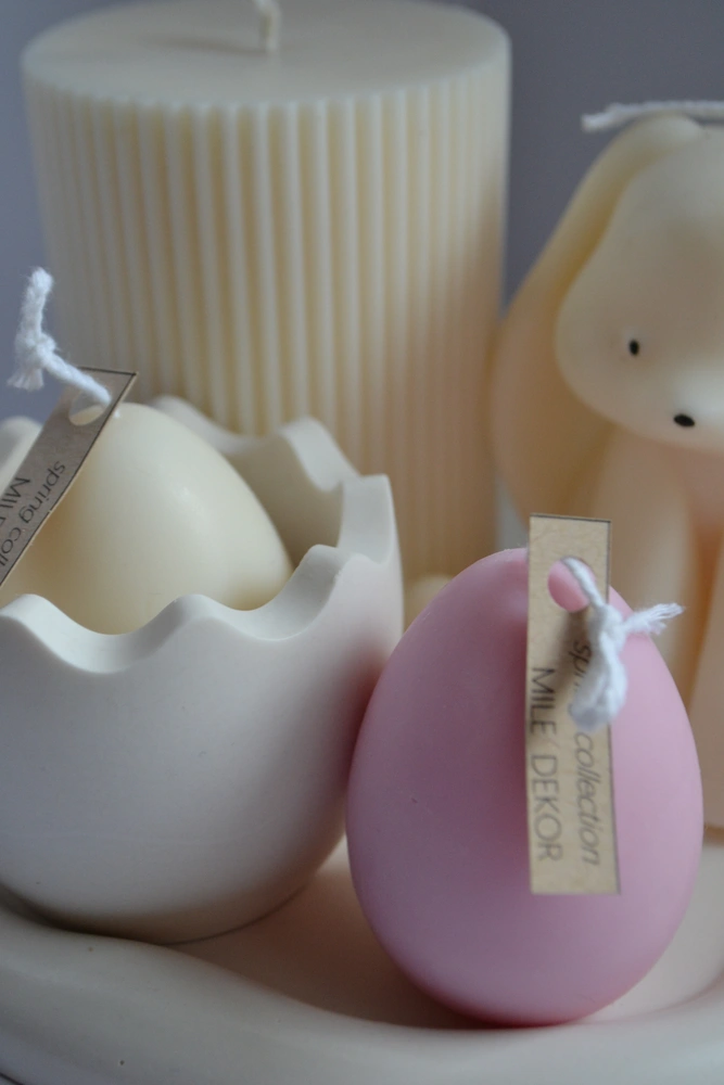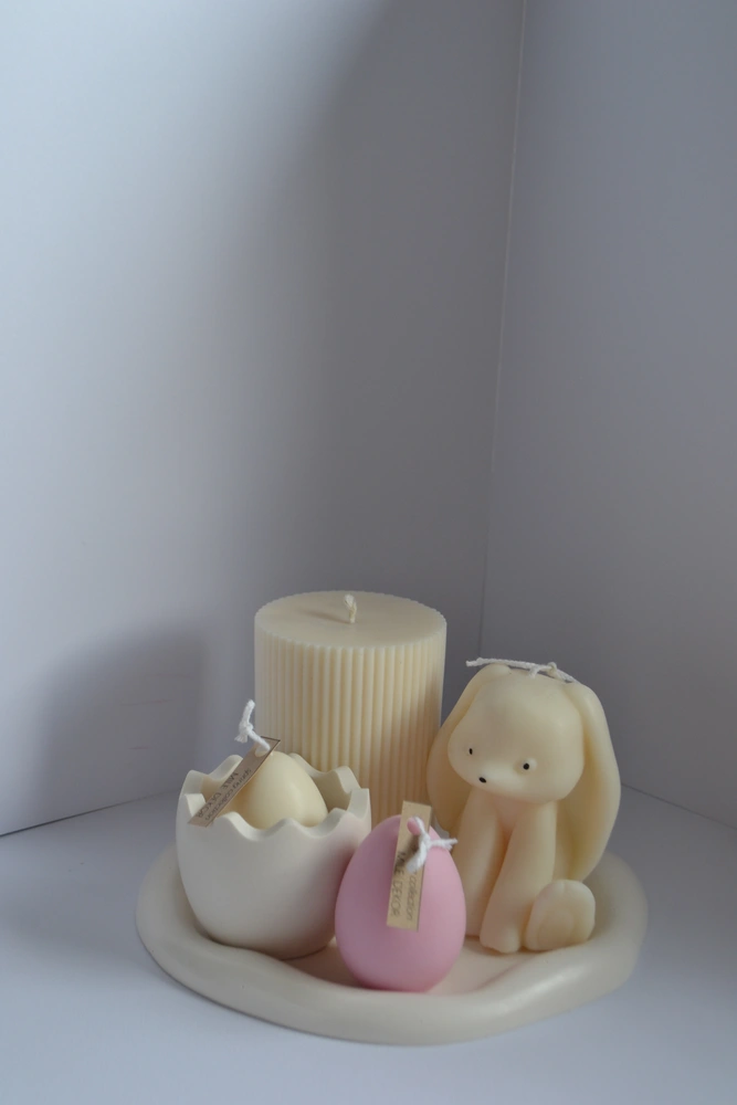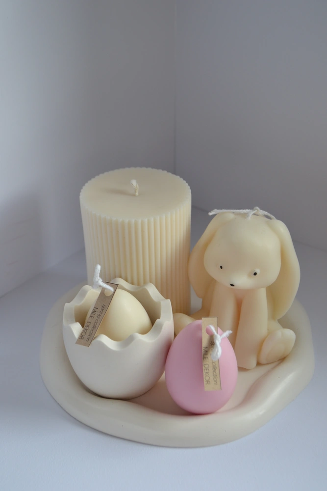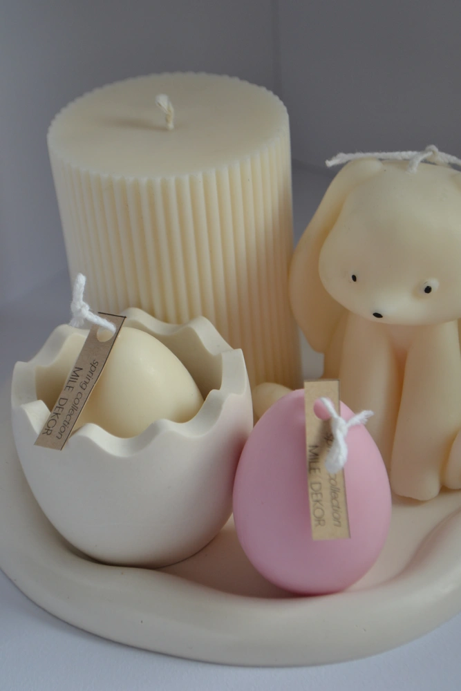 set obsahuje: podnos MILO S, sviečku BELLA S, škrupinku s krémovým vajíčkom, ružové vajíčko, zajačika